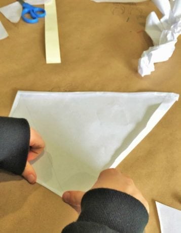 2. Cut and fold. Cut out the kite shape, then fold the edges under and tape them down.