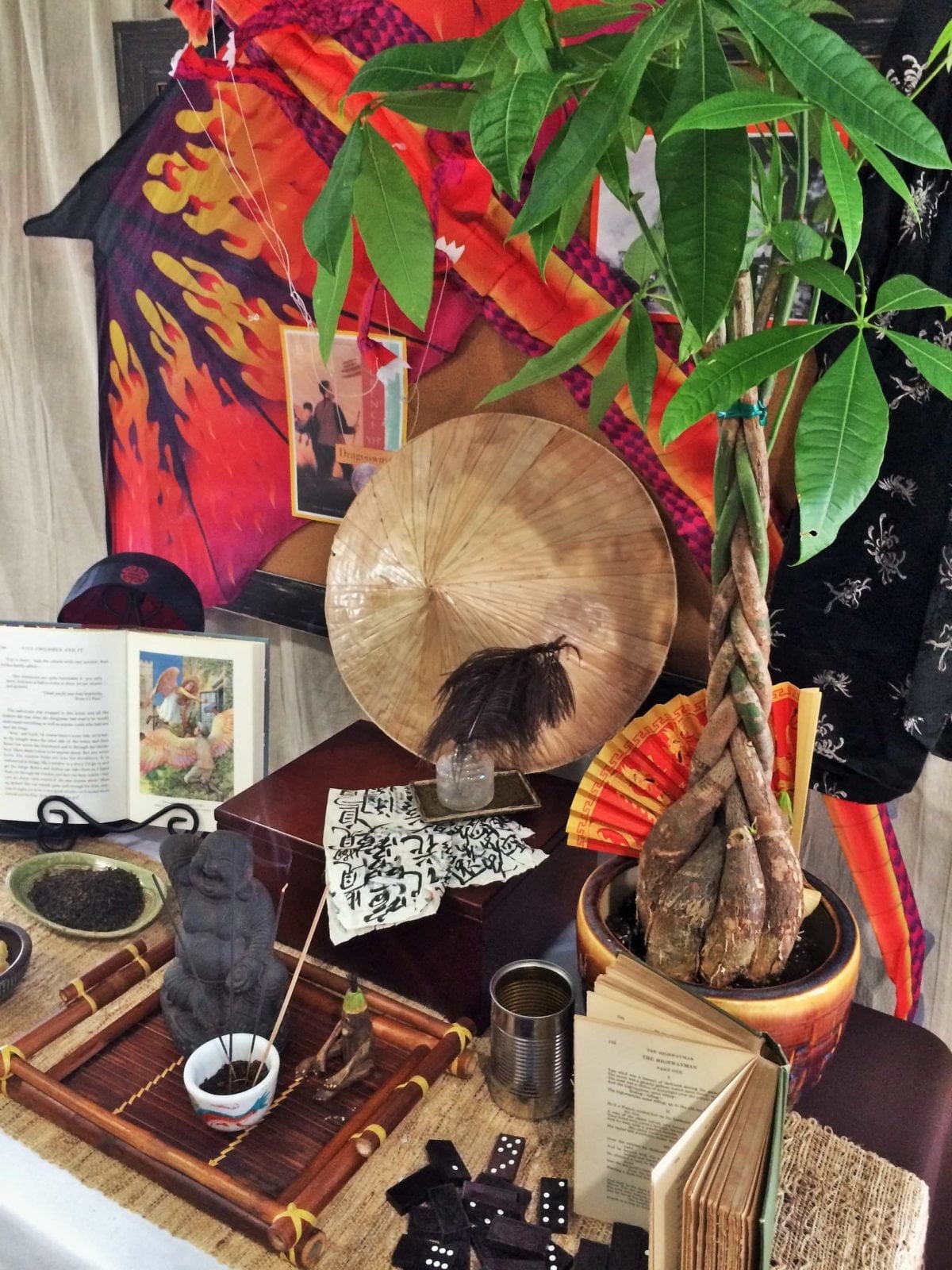 There were presents, of course. White Deer gave us a little statue of the Buddha-to-be, a happy, laughing god... -p. 92 | [On Polk Street the]first thing [Father] did was to put up a shelf. Then he set Monkey and the Buddha-to-be on it. He placed the cup of soil before them and stuck some incense sticks into the soil and lit them . . . -p. 99