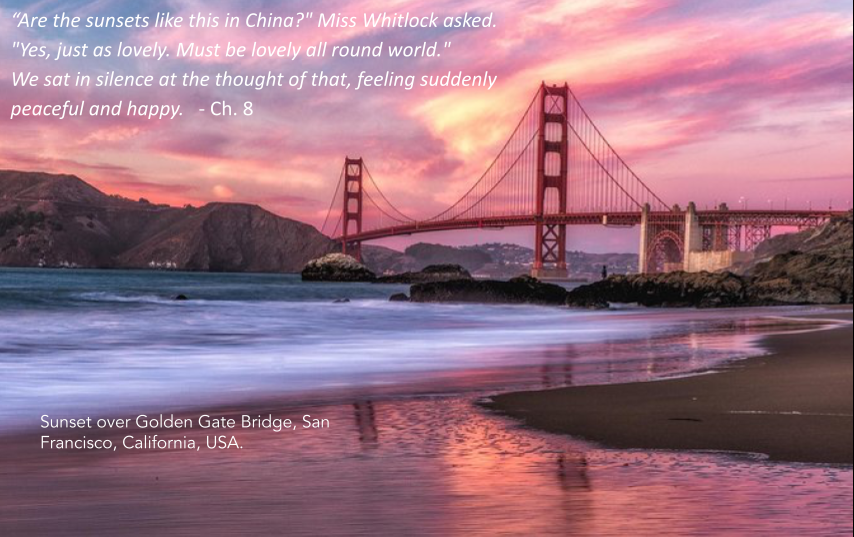 Then, to represent that trans-Pacific bond, have the kids paint the image (in our printables) of a Chinese junk sailing on San Francisco Bay, choosing the colors for the water and sky as described in the excerpts. In other words, the water should be a milky, sunset-red like the Pearl River, and the sky should be a glorious orange-red-purple, as it was that special night on the beach in San Francisco. (The famous bridge on our template wasn't built yet in Moon Shadow's time, but like the Chinese junk, it's an icon of a culture and place.)