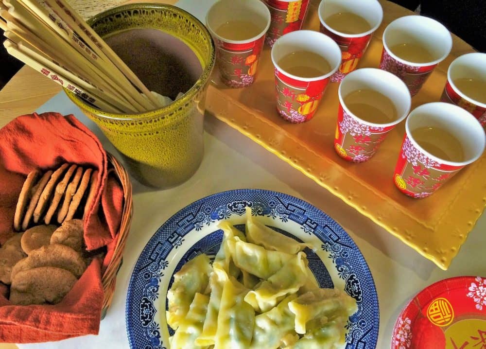 For a (non-scaly) bite of Dragonwings, we recreated the beach picnic shared by Moon Shadow, Windrider, Robin, and Miss Whitlaw. Gingersnaps, hot tea, and steamed dumplings gave us a delicious taste of this cross-cultural scene. We served the dumplings with chopsticks, and pretended we had purchased them in the Tang people’s town that morning. For our tea, we chose the jasmine tea that Moon Shadow had brought to Miss Whitlaw: