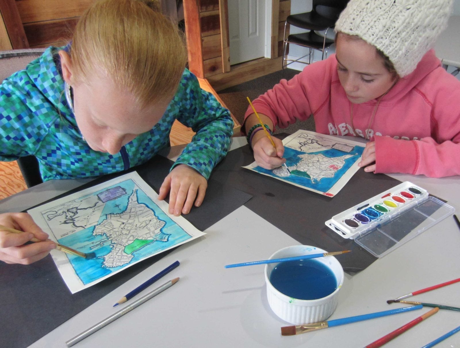 Finish the maps by painting all the water around Boston and Charles Town with beautiful watercolors while listening to American Colonial music.